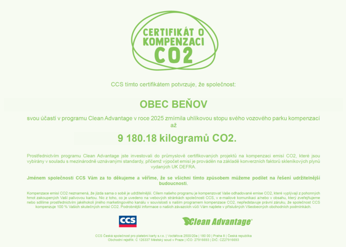 OBEC BEŇOV svou účastí v programu Clean Advantage v roce 2025 zmírnila uhlíkovou stopu svého vozového parku kompenzací až 9180.18 kilogramů CO2. Tímto získala certifikát CCS a ocenění za investici do průmyslově cetrifikovaných projektů na kompenzaci emisí CO2, které jsou vybírány v souladu s mezinárodně uznávanými standardy, přičemž výpočet emisí je prováděn na základě konverzních faktorů skleníkových plynů vydaných UK DEFRA.
