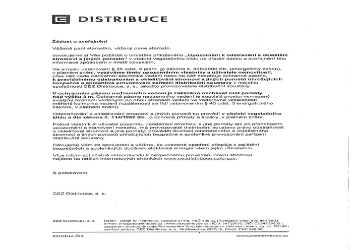 Upozornění k odstranění a okleštění stromoví a jiných porostů - ČEZ